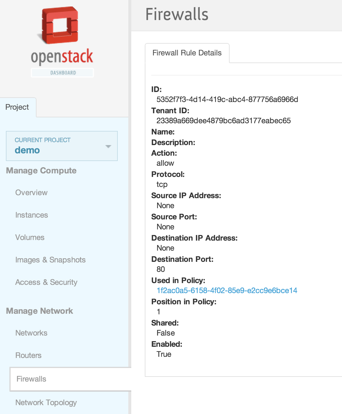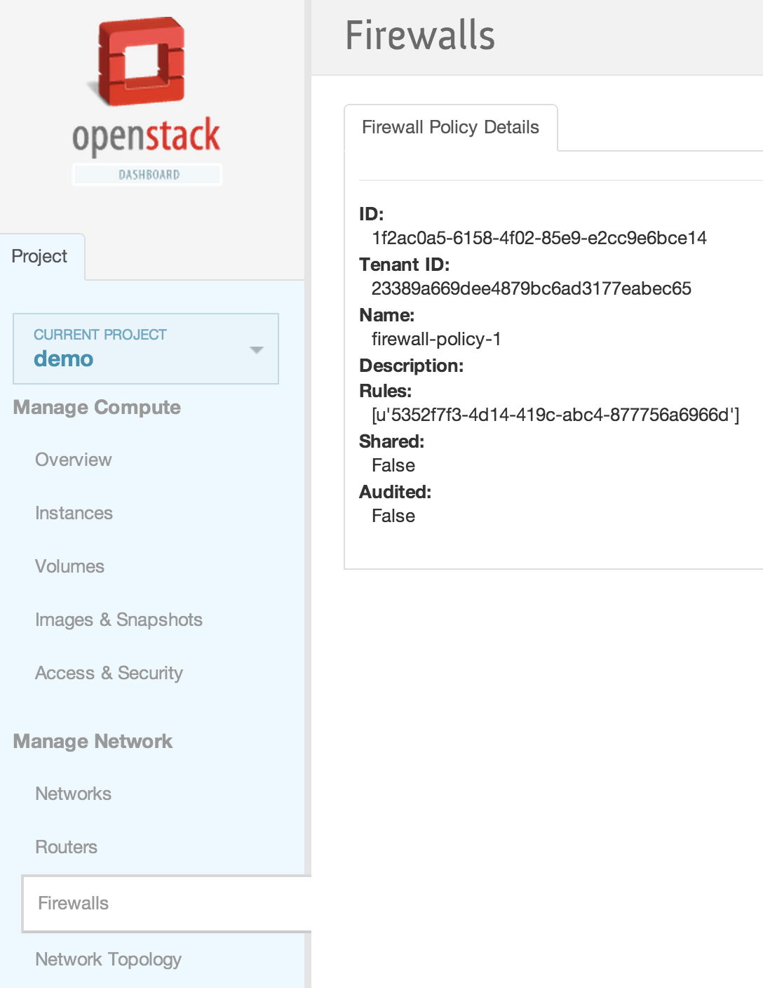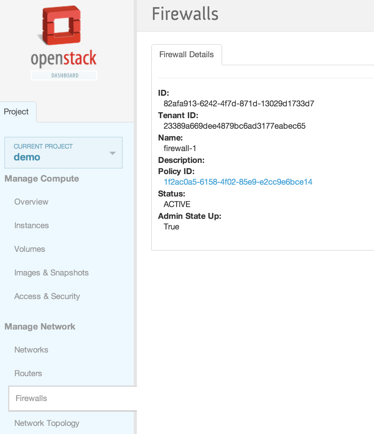 neutron firewall-show 28530399-d8ee-4700-9685-ee5d645f4d59 +--------------------+--------------------------------------+ | Field | Value | +--------------------+--------------------------------------+ | admin_state_up | True | | description | | | firewall_policy_id | 257f0a59-5b16-486b-aae2-b57c60e2053f | | id | 28530399-d8ee-4700-9685-ee5d645f4d59 | | name | | | status | ACTIVE | | tenant_id | baaaf4da44874e3f82ff93beba64117e | +--------------------+--------------------------------------+