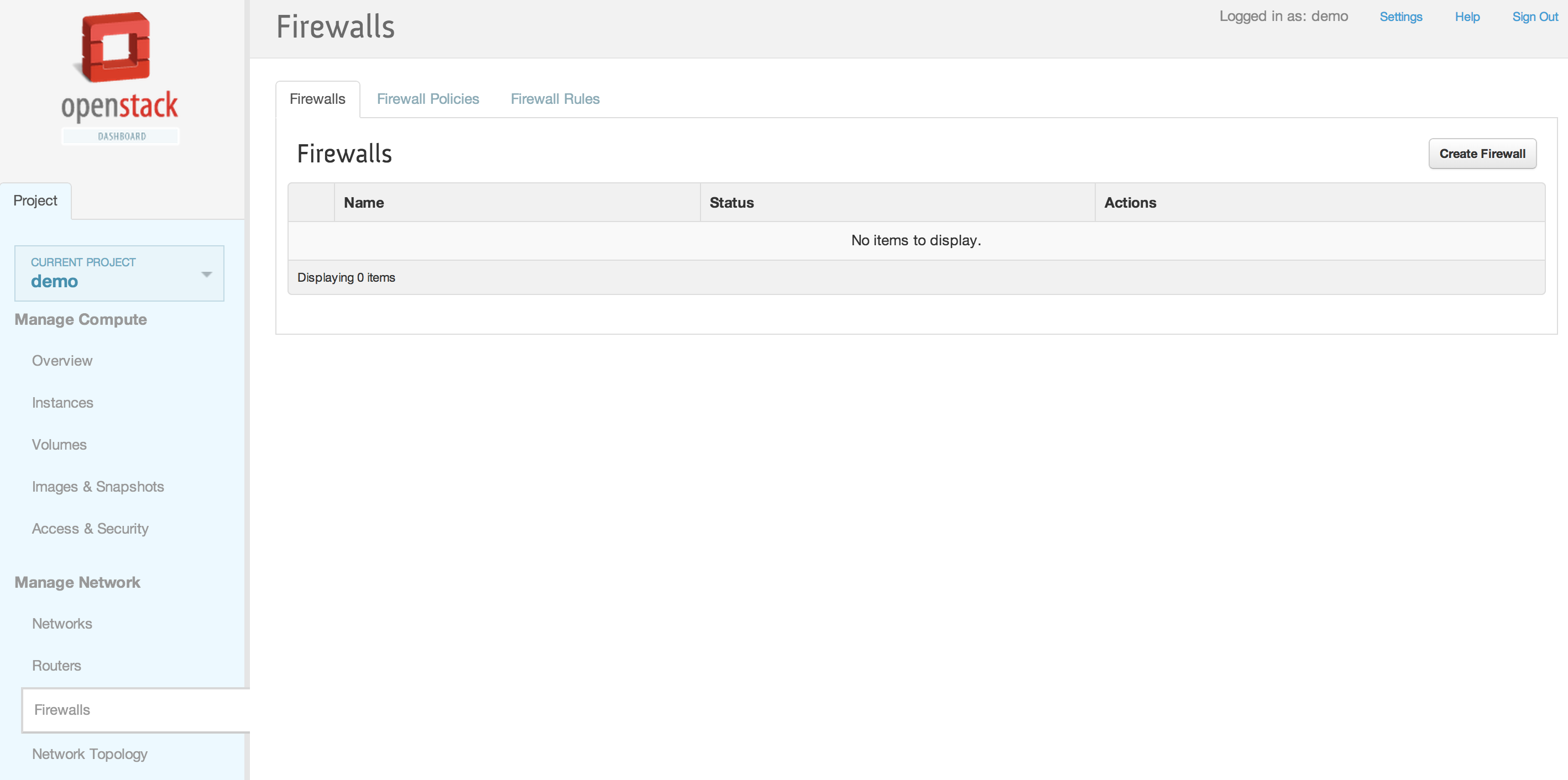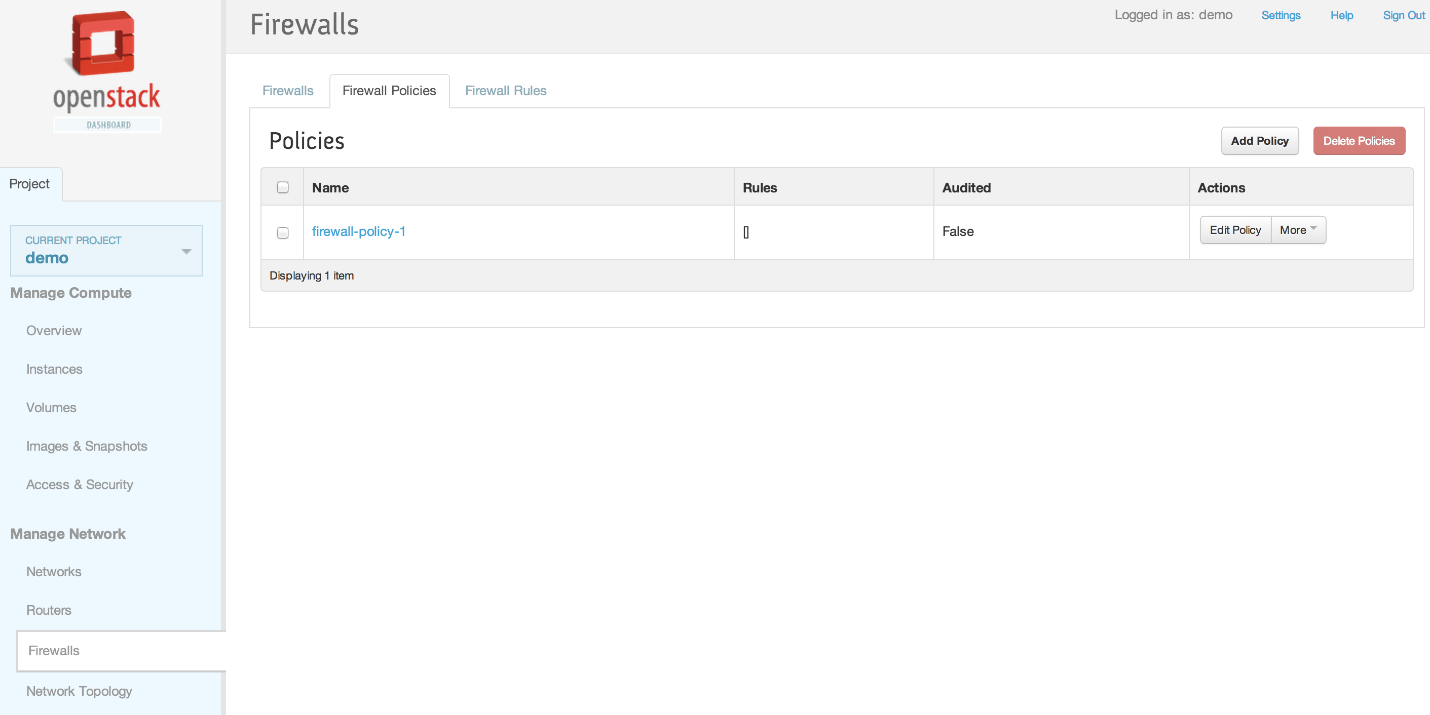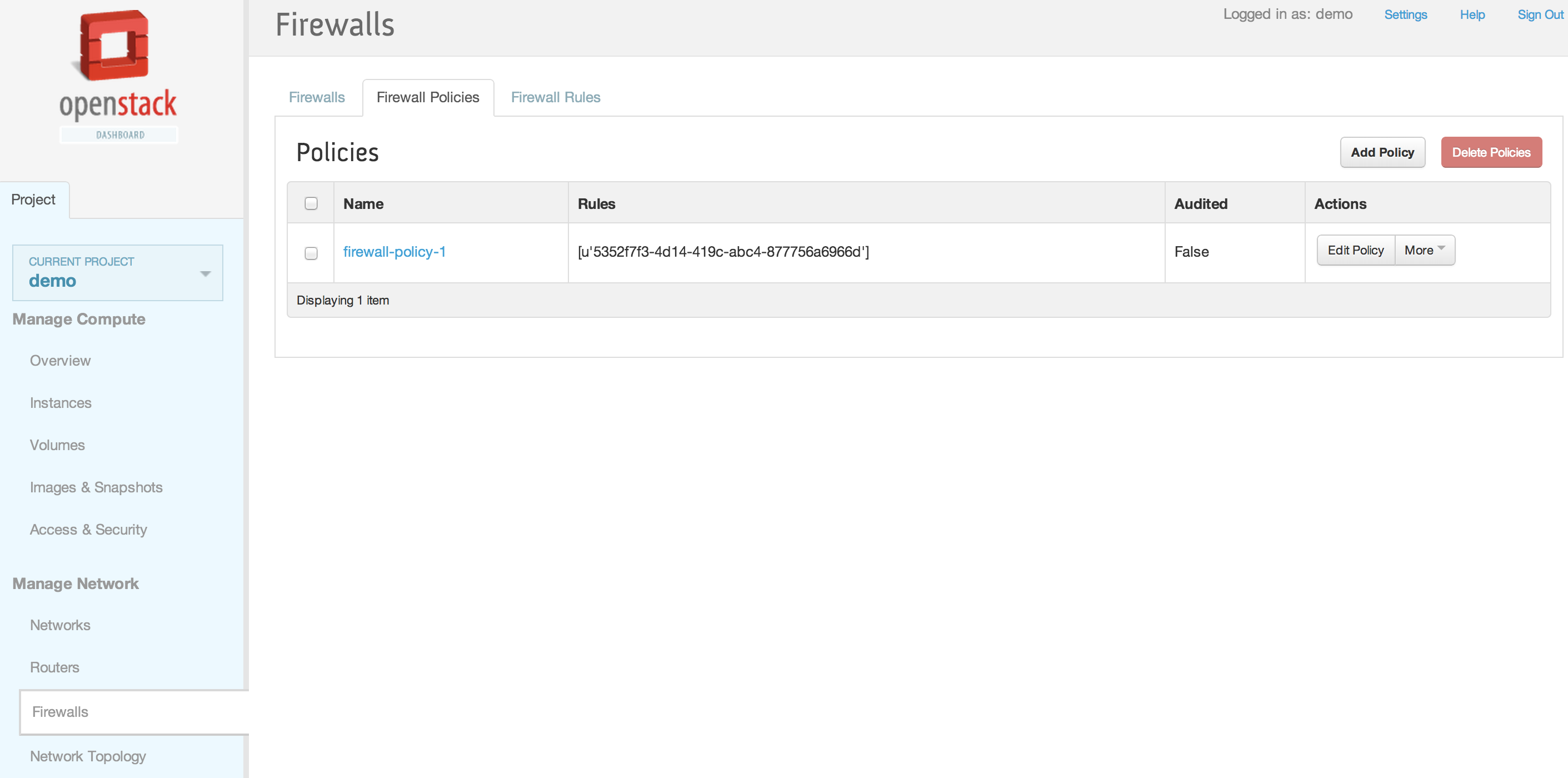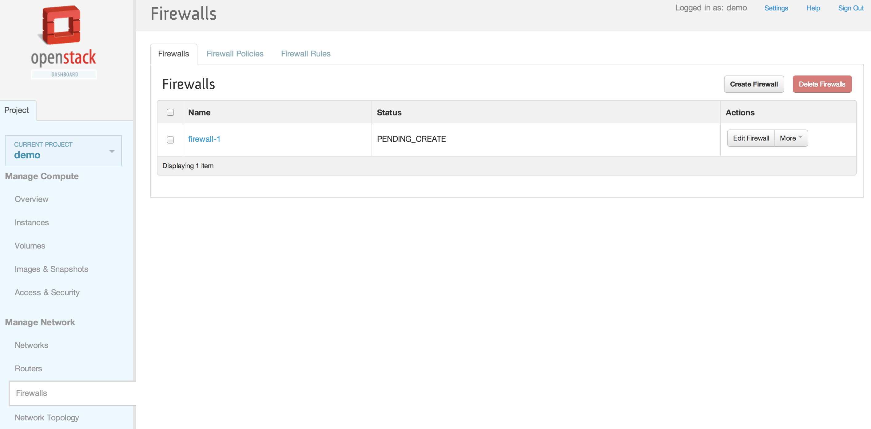 neutron firewall-show 28530399-d8ee-4700-9685-ee5d645f4d59 +--------------------+--------------------------------------+ | Field | Value | +--------------------+--------------------------------------+ | admin_state_up | True | | description | | | firewall_policy_id | 257f0a59-5b16-486b-aae2-b57c60e2053f | | id | 28530399-d8ee-4700-9685-ee5d645f4d59 | | name | | | status | ACTIVE | | tenant_id | baaaf4da44874e3f82ff93beba64117e | +--------------------+--------------------------------------+