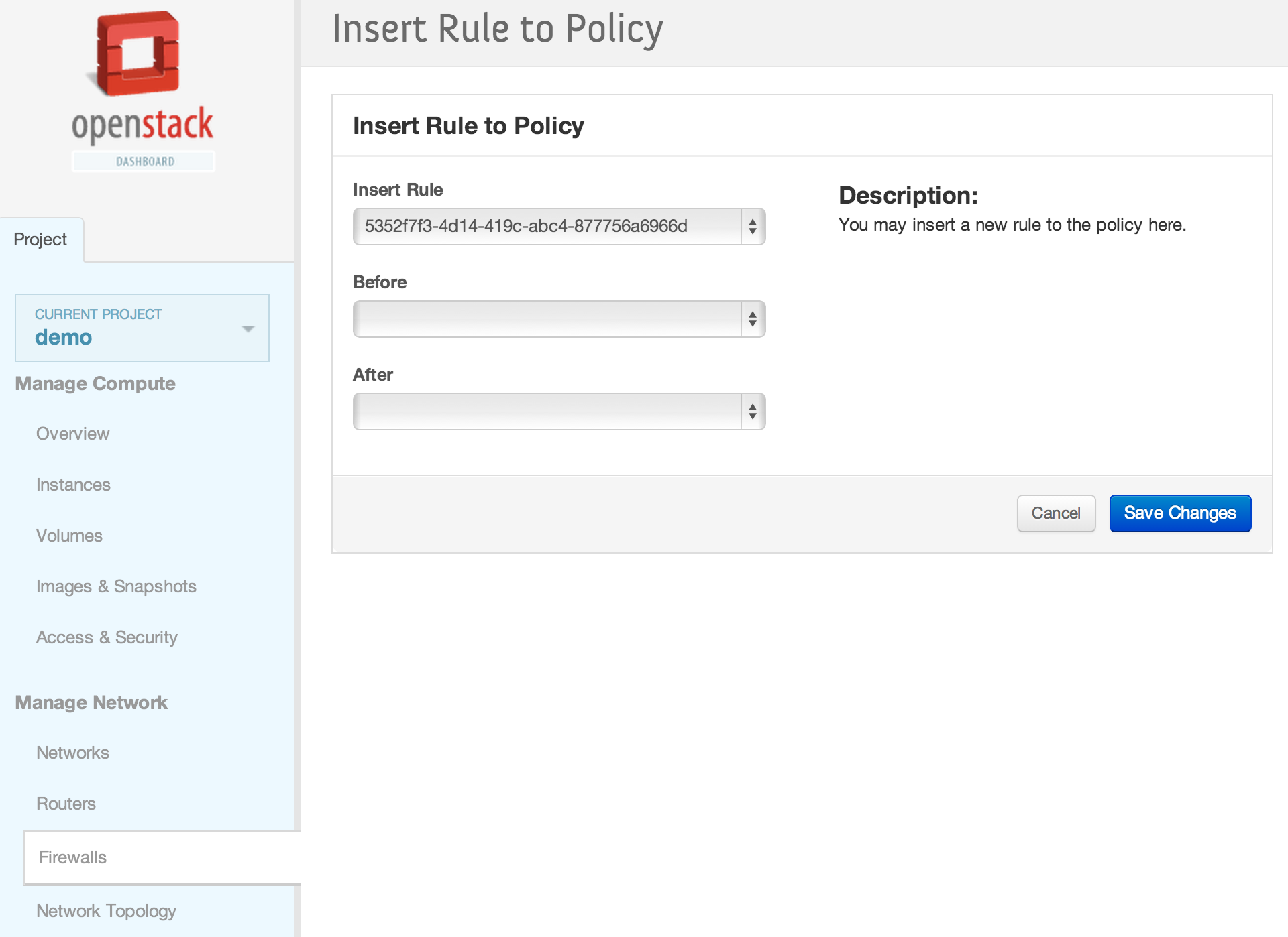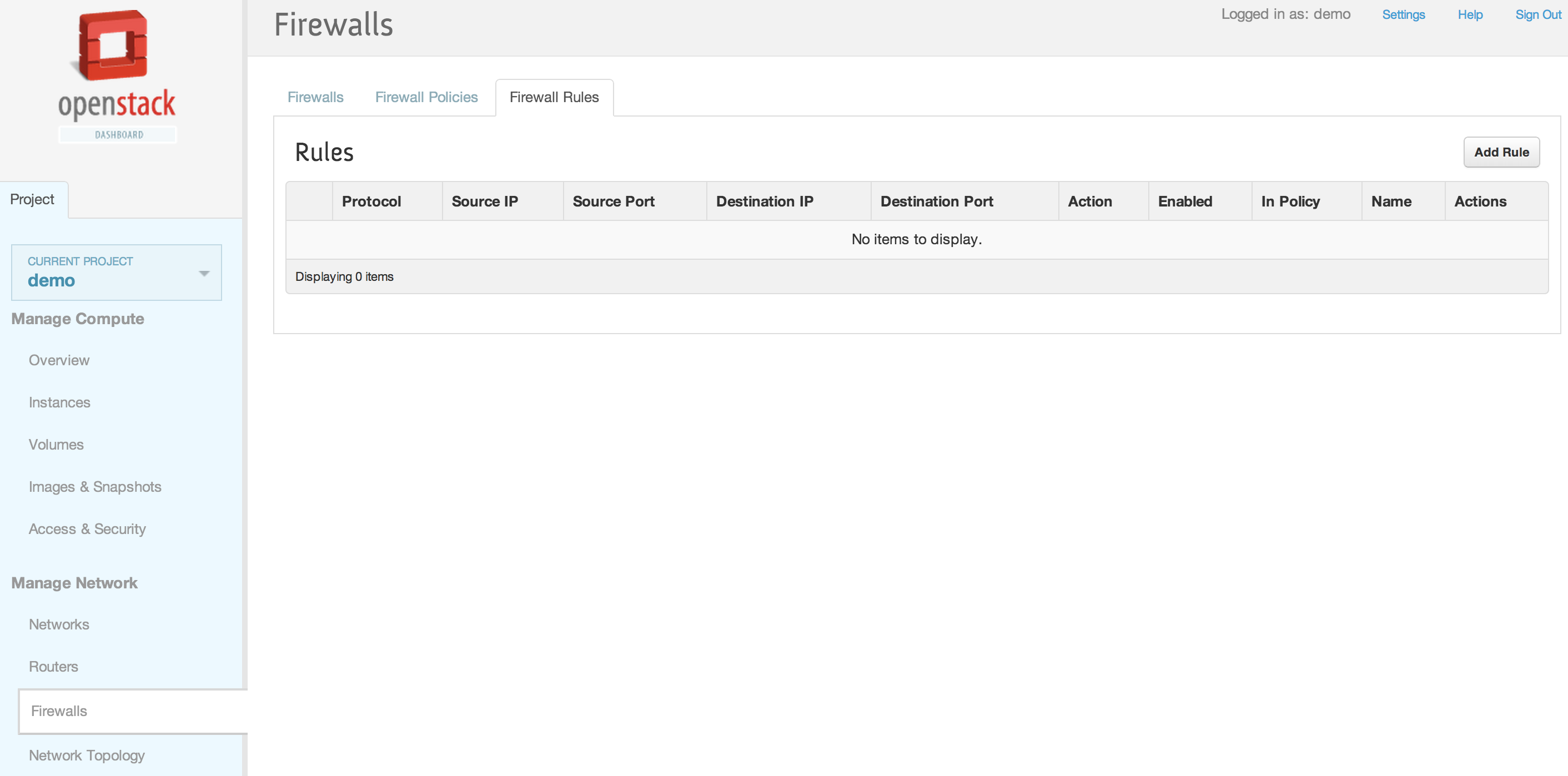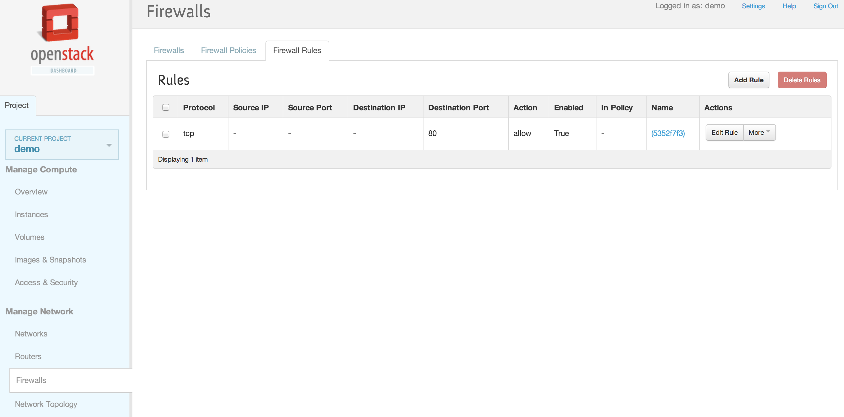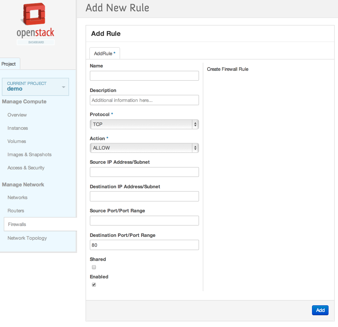 neutron firewall-rule-create --protocol tcp --destination-port 80 --action allow Created a new firewall_rule: +------------------------+--------------------------------------+ | Field | Value | +------------------------+--------------------------------------+ | action | allow | | description | | | destination_ip_address | | | destination_port | 80 | | enabled | True | | firewall_policy_id | | | id | 1283a548-9ca8-4a7b-a187-fc21c7fefe8e | | ip_version | 4 | | name | | | position | | | protocol | tcp | | shared | False | | source_ip_address | | | source_port | | | tenant_id | baaaf4da44874e3f82ff93beba64117e | +------------------------+--------------------------------------+