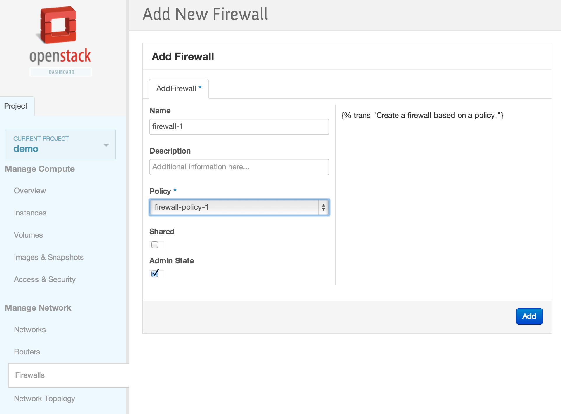 neutron firewall-create 257f0a59-5b16-486b-aae2-b57c60e2053f Created a new firewall: +--------------------+--------------------------------------+ | Field | Value | +--------------------+--------------------------------------+ | admin_state_up | True | | description | | | firewall_policy_id | 257f0a59-5b16-486b-aae2-b57c60e2053f | | id | 28530399-d8ee-4700-9685-ee5d645f4d59 | | name | | | status | PENDING_CREATE | | tenant_id | baaaf4da44874e3f82ff93beba64117e | +--------------------+--------------------------------------+