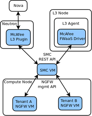 L3 插件在 Neutron 内部运行,并用路由器 VM 替换上游网络命名空间实现。该插件与 Nova 通信以实例化 VM 并将其作为配置的路由器端口附加。NGFW 接口和路由配置通过 SMC REST API 传递给预配置的通用 SMC 服务器。SMC 然后配置 NGFW VM。