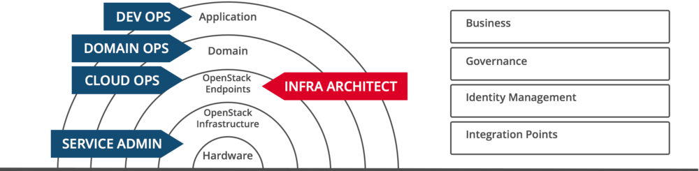 安装和配置OpenStack云。 | OpenStack云的日常运营和管理,包括备份、灾难恢复、管理OpenStack云提供的基础设施和平台服务。 | 对OpenStack云执行更新和更新后验证。 | 最终用户使用OpenStack云服务。 |