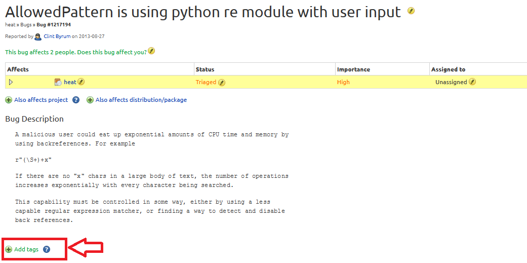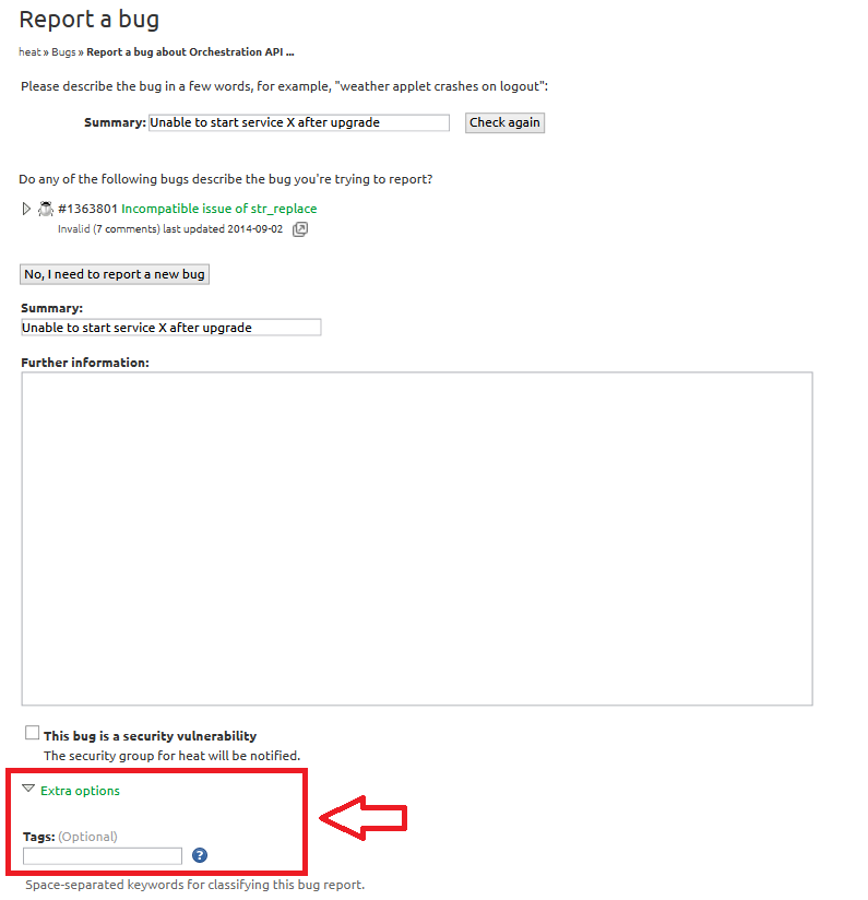 - 使用“ops”标签标记错误。在报告新错误时,您需要展开“额外选项”字段以添加标签(参见 图像)。对于现有错误, “添加标签”链接就在错误的描述之后(参见 图像)。